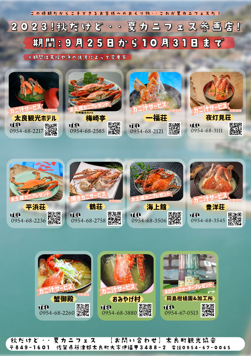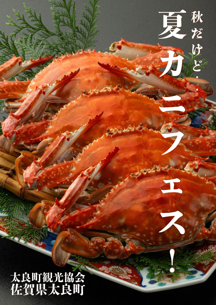 昨年の人気企画!秋だけど「夏カニフェス!」が今年も開催されます。 期間は2023年9月25日~10月31日 期間中、町内の旅館にご宿泊のお客様へ、各旅館ならではの特典をご用意! 太良観光ホテルでは、ご朝食時にカニの味噌汁をサービスいたします。 ぜひ、旨みたっぷりの夏カニを味わいに太良町へおこしください。