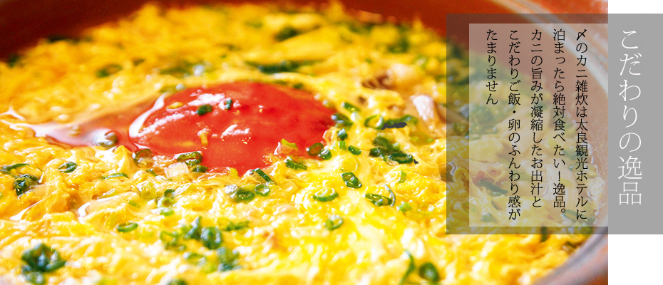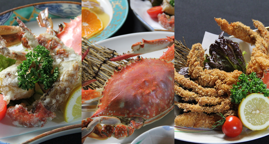 冬場は卵がたっぷりのメスガニも美味しく味わえ、年中蟹の美味しさを楽しむことができます。時期によって大きさが変わるので、コースによっては大きなカニ1杯の場合もありますし、2杯でお出しすることもございます。茹でカニ、焼きカニ、天ぷら、雑炊など、カニをたっぷり味わえるお料理コースをご用意しております。また、9月~10月は珍しい「脱皮カニ」も味わうことができます。
